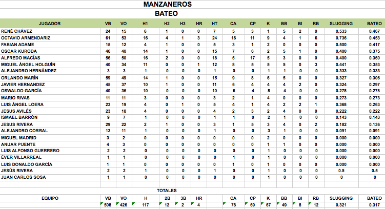 www.beisbolcuauhtemoc.com.- Octavio “Toronjo” Armendáriz, se sigue manteniendo como el manzaneros numero uno, al llegar con un porcentaje de bateo de 0.453, producto de 24 hits en 53 turnos oficiales, 4 dobles, 1 triple, 3 cuadrangulares, 16 carreras producidas y 11 anotadas, además de 6 robos de base.
