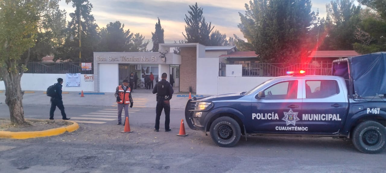 Cuauhtémoc, Chih.- 07:35 a 08:10 horas, la Policía Municipal realizó la vigilancia en centros escolares de la ciudad, para garantizar la seguridad de los entornos de instituciones educativas, se atendió el horario de acceso de la Escuela Secundaria Técnica Número 51, apoyando además con labores de proximidad y el trabajo de los guardias escolares de la ciudad.