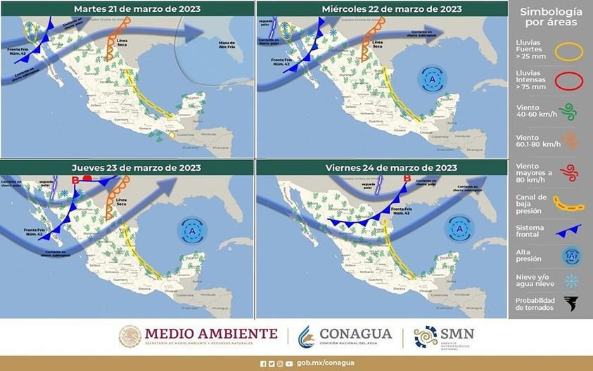 Mientras para el jueves 23 se prevé que el sistema frontal 43 se mantenga semiestacionado sobre el noroccidente del territorio estatal. Además, en la mayor parte de la porción occidental desde Ascensión hasta la región serrana del estado, se esperan vientos con rachas que pueden oscilar entre 70 y 90 km/h.