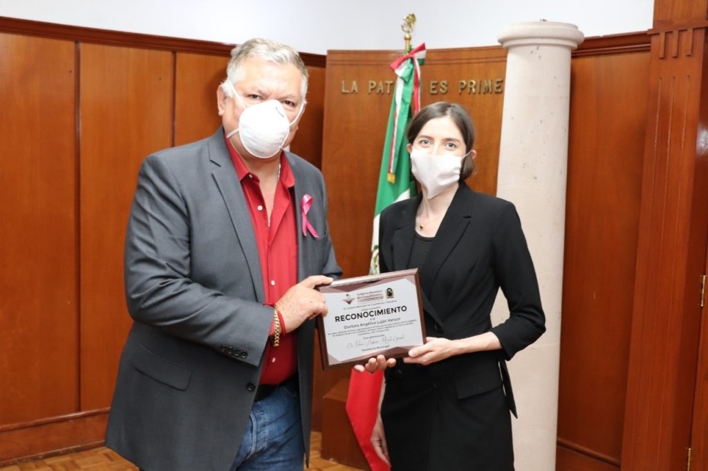 Por haber logrado el primer lugar en el Concurso Nacional de Residentes de Posgrado en la Especialidad de Ortodoncia, el Presidente Municipal, Romeo Antonio Morales Esponda, entregó una placa de reconocimiento a la doctora cuauhtemense Angélica Luján Venzor.
