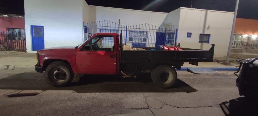 En la plataforma del vehiculo se observó un tanque de gas en color blanco con naranja de 30 kilos, así como algunos botes de plástico, vacios y 5 canastas para el mandado.