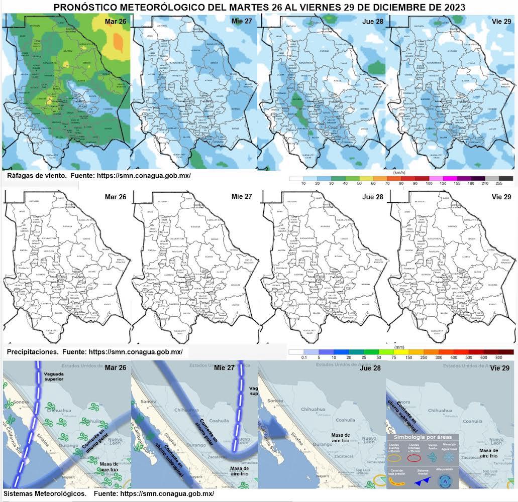 En lo referente al viento, estos irán de 5 a 20 kilómetros por hora (km/h) con ráfagas que pueden alcanzar los 45 km/h en Ahumada, Guadalupe, Palomas, Nuevo Casas Grandes, Guerrero, Carichí, Cuauhtémoc, Cusihuiriachi, Riva Palacio, Majalca, Coyame, Ojinaga y Manuel Benavides.