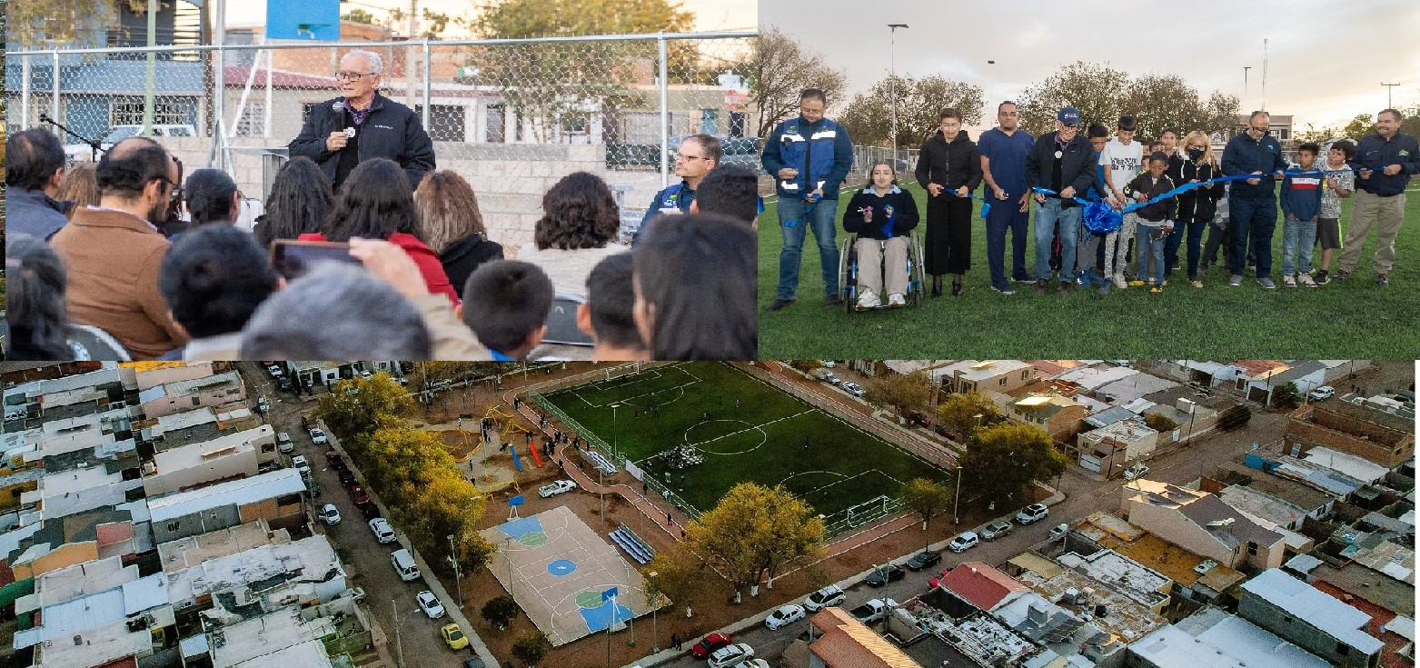 La inversión de esta obra fue de $4,139,618.22, e incluye la instalación de pasto sintético en una cancha de futbol 7, donde niños y jóvenes, principalmente, podrán disfrutar del deporte.