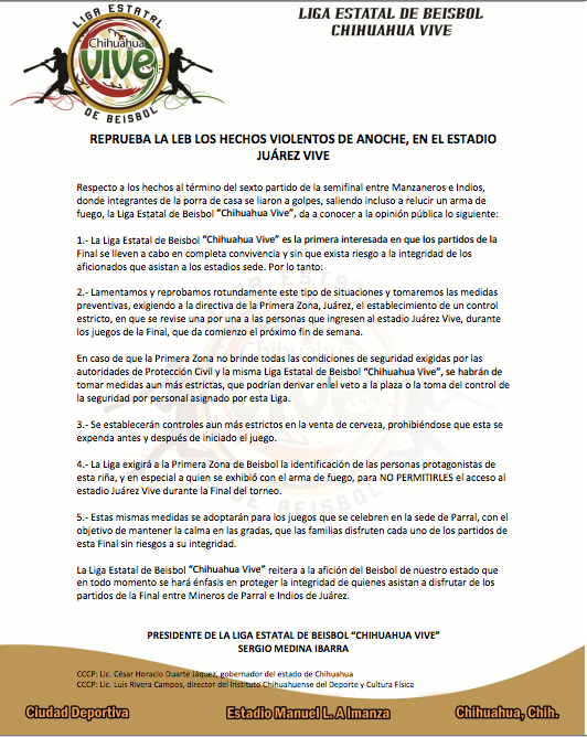 fuego, la Liga Estatal de Beisbol “Chihuahua Vive”, da a conocer a la opinión pública lo siguiente: