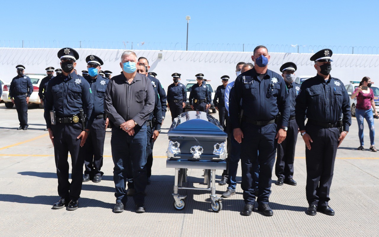 El Presidente Municipal, Romeo Antonio Morales Esponda, junto con el comisario en jefe del Mando Único y Director Operativo de la Dirección de Seguridad Pública, Enrique Tarango Muñiz; el delegado administrativo de Vialidad, Jorge Iván Villagrán Salas; el encargado del mando único en Vialidad, José Bojórquez Barbier; el subdirector operativo de Seguridad Pública, Sergio Proa Flores y el Director Administrativo de Seguridad Pública, Juan Carlos Rentería Villegas, realizaron una guardia de honor al lado del féretro.