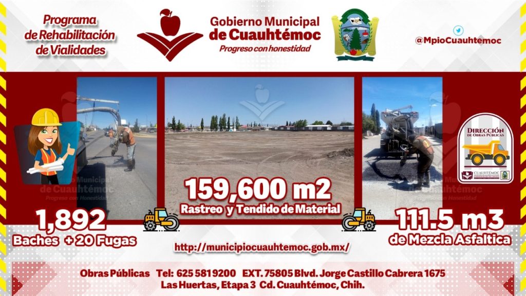 El Gobierno Municipal de Cuauhtémoc avanza en la rehabilitación de calles y avenidas con el trabajo intensivo y permanente de bacheo, que ha permitido en los últimos 29 días un trabajo de reparación en mil 892 desperfectos asfálticos de la zona centro y diversas colonias de la ciudad.