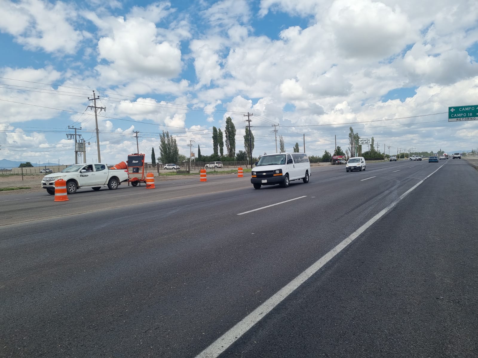 Elementos como trafitambos, barreras, y flechas luminosas, son utilizadas en la desviación para poder realizar una fluida circulación sobre la carretera por los trabajos de fresado y recarpeteo que se llevan a cabo en un sentido de sur a norte este tramo del kilómetro 16 al kilómetro 14, en un sentido de norte a sur.