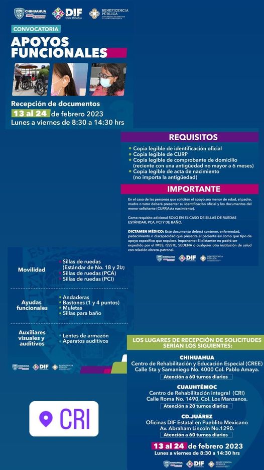 Extienden hasta el 3 DE MARZO la convocatoria para inscribirse en el programa Apoyos Funcionales del DIF Estatal. Si usted necesita una silla de ruedas, un andador, un bastón, muletas, una silla para baño, lentes o aparato auditivo, solicítelo en el CRI ubicado en la calle Roma 1490, en ciudad Cuauhtémoc. Para mayor información, favor de comunicarse al (625) 581 9300 extensión 77590.