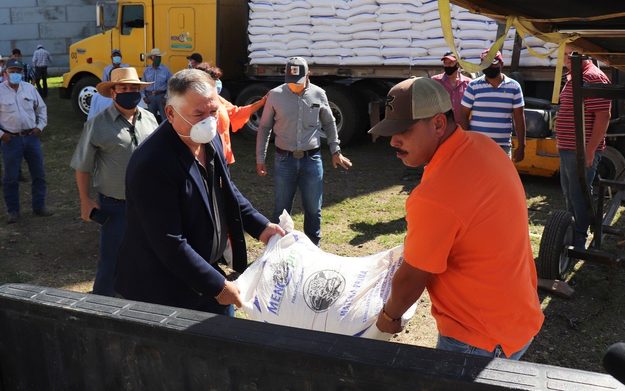 De manera conjunta, el Presidente Municipal, Romeo Antonio Morales Esponda, acompañado de la Directora de Desarrollo Rural, Carolina Jiménez Ramos, así como del director de Servicios Públicos, Pedro José González Baray y del residente de la dependencia estatal, Jaime Trujillo Delgado, repartieron a los productores 120 toneladas que fueron aportadas por el Gobierno del Estado con un apoyo subsidiado al 50%.