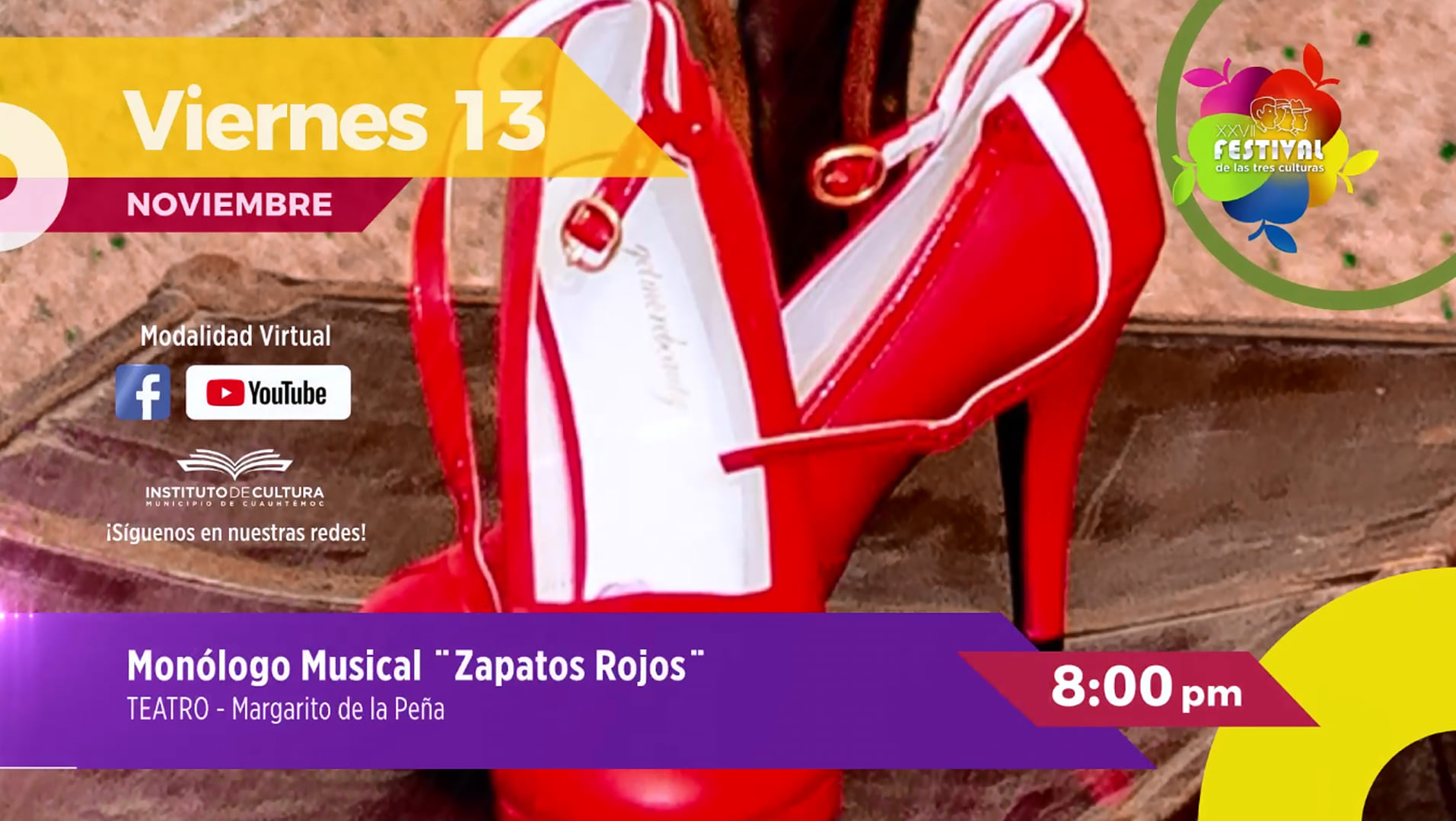 El monólogo musical ZAPATOS ROJOS es una producción teatral del polifacético artista anahuaquense Margarito de la Peña. Con un libreto escrito por José Luis Domínguez, el monólogo también incluye la participación de Aracely Arias. Reserva tu Viernes y disfruta de una propuesta teatral diferente desde la comodidad de tu casa.