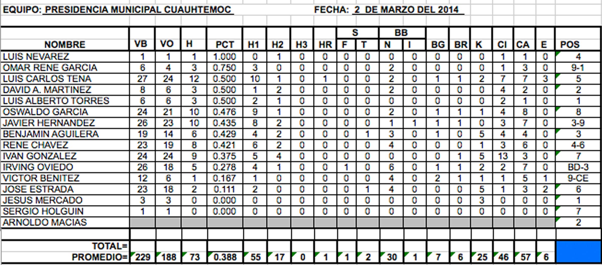 www.beisbolcuauhtemoc.com.- Los numeritos del conjunto de Presidencia de Cuauhtémoc, nos dejan como el mejor bateador hasta la tercera jornada a Luis Carlos Tena con un porcentaje de 0.500, producto de 24 turnos oficiales con 12 hits, en tanto en el departamento de pitcheo, Ricardo Sandoval marcha perfecto con 3 victorias sin descalabro.